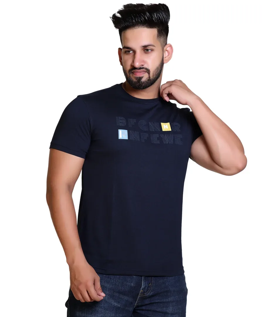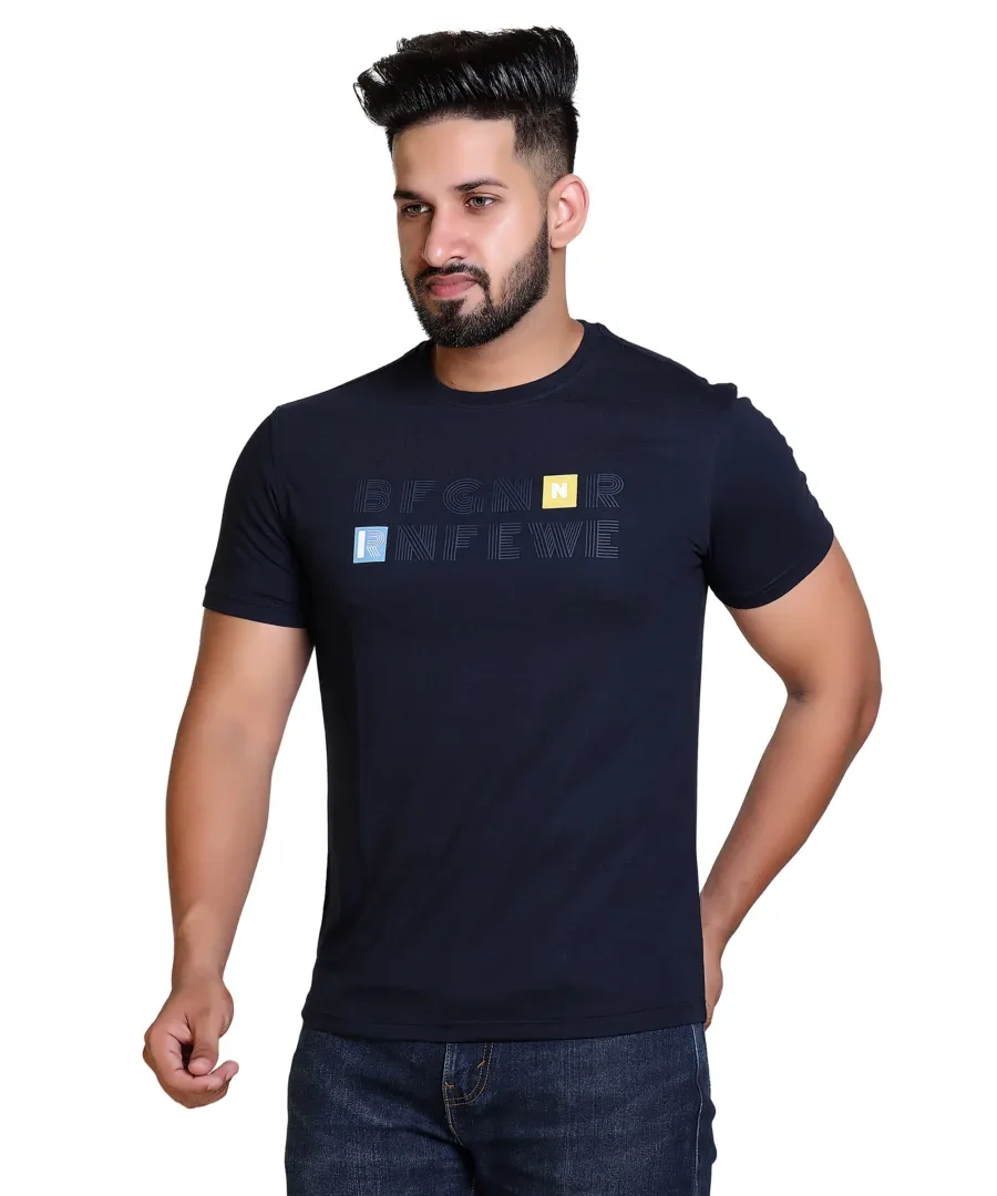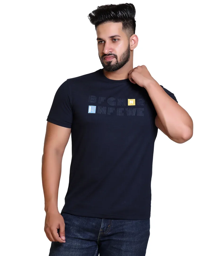 Embrace a blend of style and comfort with the Pulakin Round Neck Printed Navy T-Shirt for Men. This versatile tee is designed to make a statement with its modern print and classic navy hue, perfect for any casual occasion.